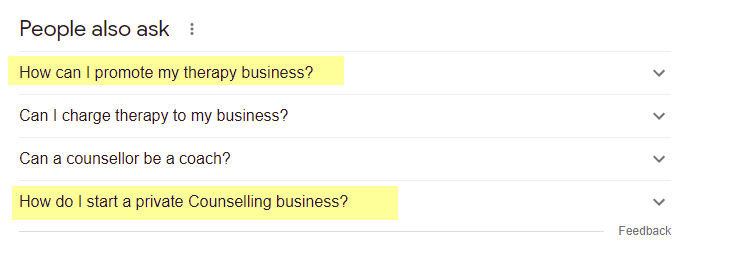 You can find long tail keywords like this using Google’s auto-complete, or looking at suggested searches at the end of a search result page. For example, search for “business coach for therapists” and then look at suggested searches to get other suggestions.