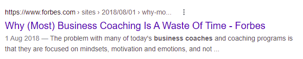 For example, Forbes’ title below suggests a different perspective than most of the results for “business coach” whilst opening a question about which coaching isn’t a waste of time.