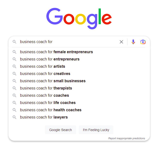 For example, if you’re a business coach, your customers might type “business coach” into Google and find you, but chances are you won’t appear for this highly competitive term.