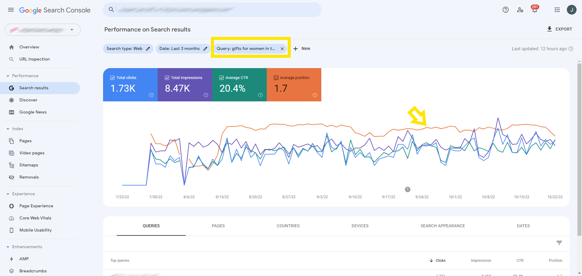 Impressions: How many people saw your site in results, and for what keyword. This tells you the wider popularity of the term (but only if you are ranking). Look closely at the average position, because if it is above 10 then you won’t see as many impressions, because users did not go past the first page of results.