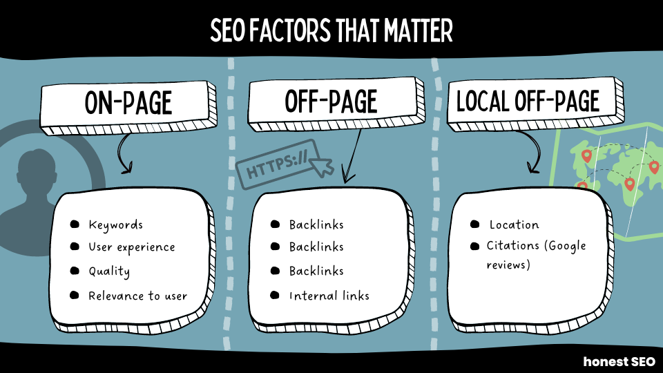 Off-page SEO, on the other hand, refers to external factors like backlinks to your site from other websites. It can also refer to your business location and reviews for local SEO.