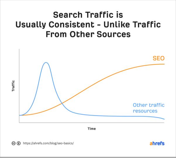 SEO traffic also tends to have higher conversion rates than any other channel, because users are actively searching out your services. Furthermore, SEO is a more consistent source of traffic than channels like social where you have to put in a lot of effort to get a viral spike in traffic.
